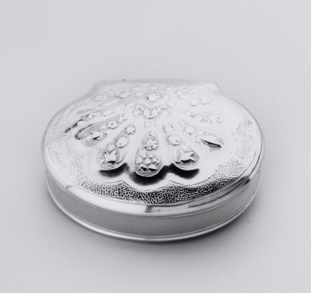 Schelpvormige doos met scharnierend deksel. Profielrand langs onderrand doos en deksel. Op deksel straalsgewijs gedreven godrons en bloemen binnen een geruwde rand. Op onderzijde bodem zijn de letters: JS/ gegraveerd, mogelijk de eigenaarsinitialen.