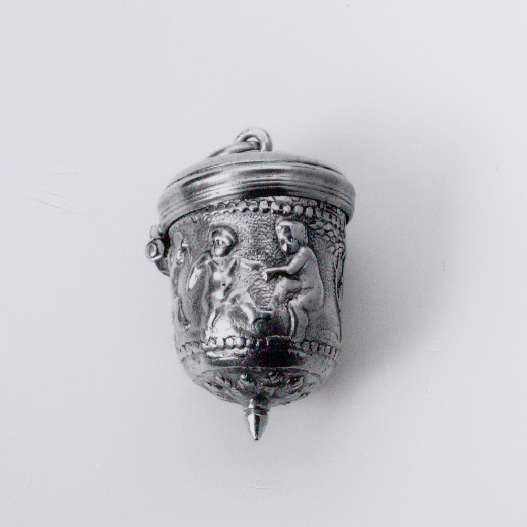 Cilindrische doos met scharnierend deksel, oog en ophangring. Profielrand langs deksel. Op wand een doorlopend decor van dansende kinderfiguren op een geponste ondergrond tussen parelranden. Onderzijde doos met straalsgewijs een rij acanthusbladeren, het midden in een punt uitlopend. Op het deksel een mannenbuste met lauwerkrans.