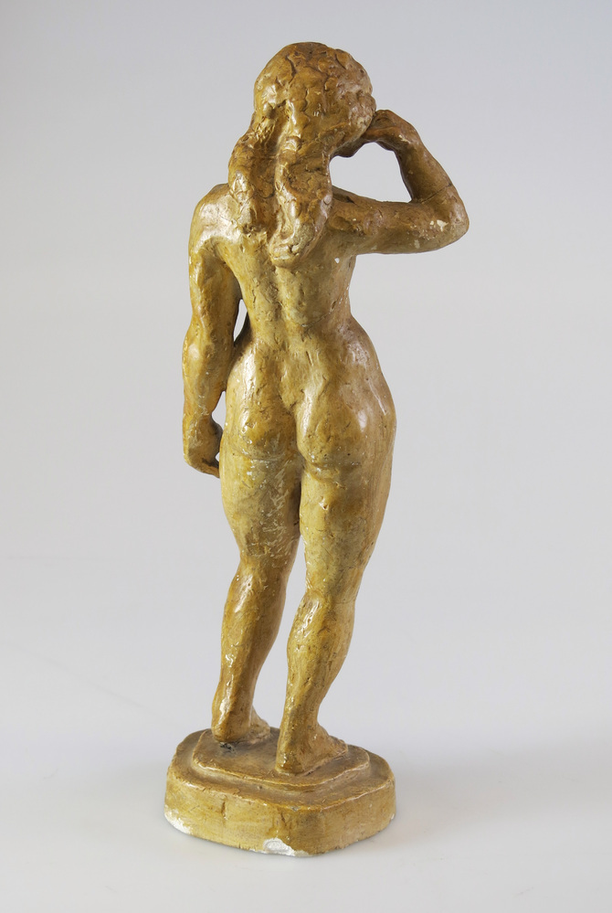 Anna Sophia Maria Elisabeth Borghmans (1915-1977), beter bekend als Truus Trompert, stond vanaf haar zestiende ruim veertig jaar lang model voor uiteenlopende schilders en beeldhouwers. Haar voluptueuze rondingen waren een begrip in de Amsterdamse kunstenaarswereld en haar artistieke persoonlijkheid heeft velen geïnspireerd. In Amsterdam zijn meerdere beelden te bewonderen waar zij model voor heeft gestaan, waaronder John Rädeckers Nederlandse maagd op het Nationaal Monument op de Dam. Trompert stond model voor meer dan honderd kunstenaars, onder wie schilder en beeldhouwer Hans Bayens (1924-2003), een leerling van Isodore Opsomer. Bayens staat bekend om zijn impressionistische schilderijen en zijn bronzen beelden van Nederlandse auteurs als Multatuli en Theo Thijssen. In dit gipsen beeldje van Trompert ligt de nadruk op de pure menselijke vorm, die aan de achterzijde van het beeldje misschien nog wel het best tot zijn recht komt. ( Sarah Remmerts de Vries)