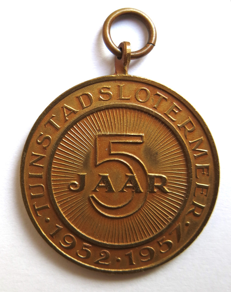 Op 7 oktober 1952 werd Tuinstad Slotermeer, als eerste van de naoorlogse stadsuitbreidingen, officieel geopend door Koningin Juliana. Er kwamen uiteindelijk zo’n 10.000 woningen te staan, die plek boden aan ongeveer 40.000 mensen. In de beginperiode kwamen er vooral jonge Amsterdamse gezinnen wonen, die de krappe eenkamerwoningen van het centrum ontvluchtten. Aan de Burgemeester de Vlugtlaan voorzagen winkels zoals een groenteman, een bakker en een slager de nieuwe inwoners van de dagelijkse benodigdheden. Toen Slotermeer in 1957 vijf jaar bestond, is deze herinneringsmedaille uitgegeven. ‘5 jaar – Tuinstad Slotermeer – 1952-1957’ is erop te lezen. ( Sarah Remmerts de Vries)