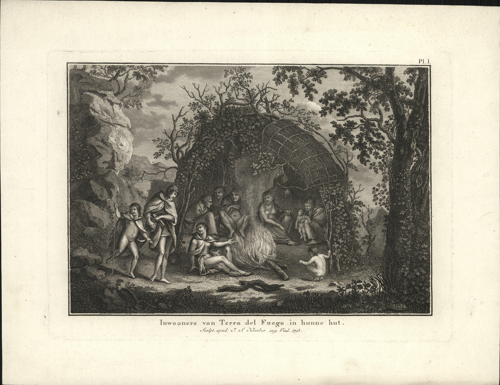 titel midden onder de afbeelding: Inwooners van Terra del Fuego in hunne hut./ Sculpt. apud. J.S. Klauber aug. Vind. 1793