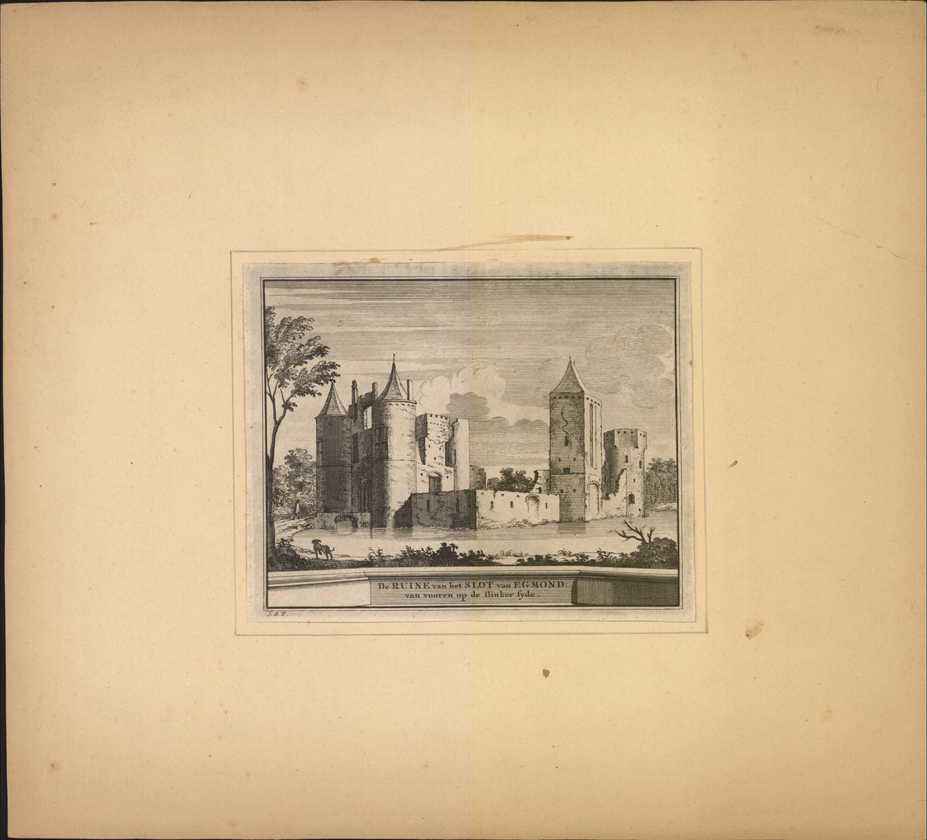 opschrift midden onder in afbeelding: De RUINE van het SLOT van EGMOND; / van vooren op de flinker syde. - aangetroffen 1985-02