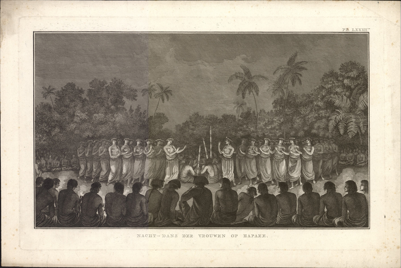 titel midden onder de afbeelding: Nacht-dans der vrouwen op Hapaee.