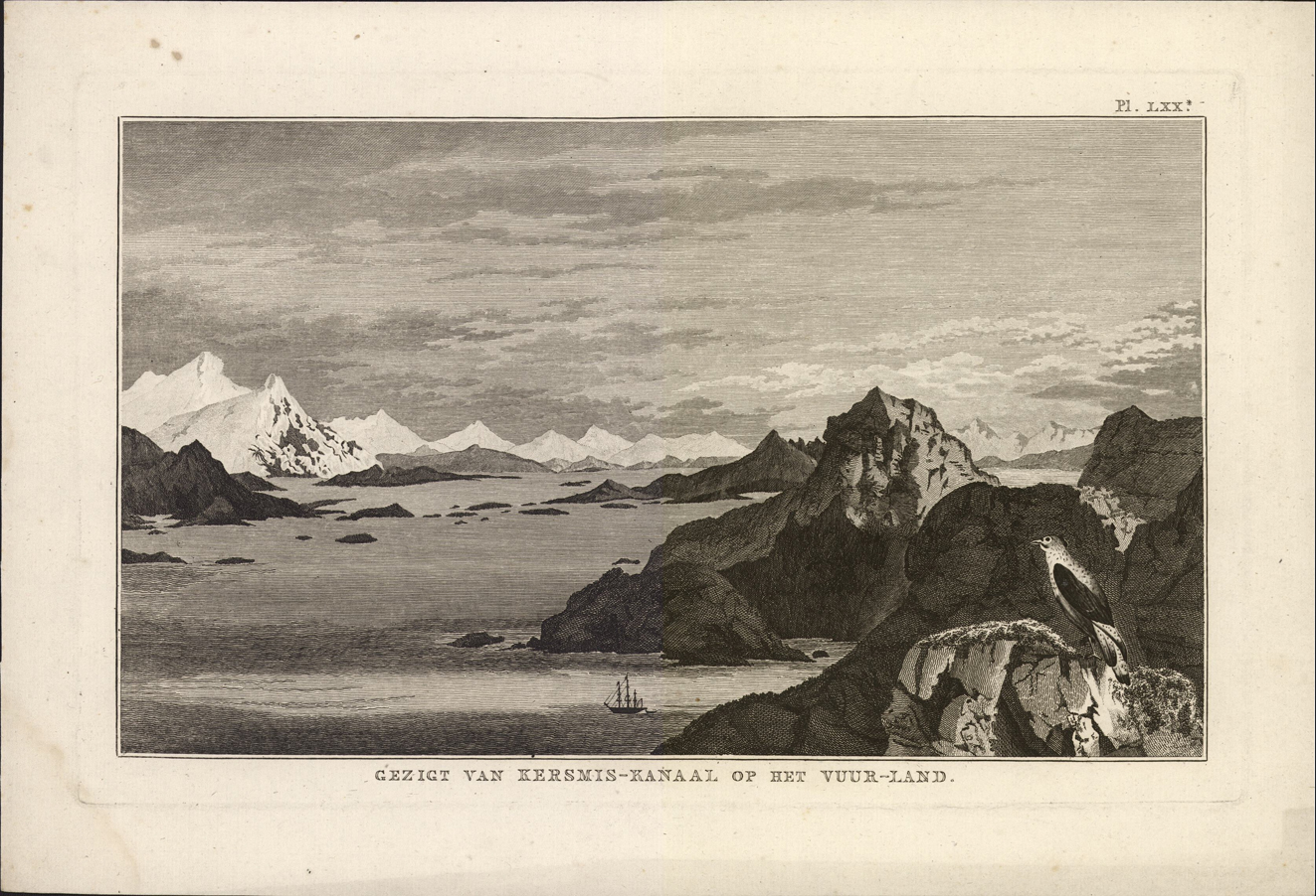 titel midden onder de afbeelding: Gezigt van Kersmis Kanaal, op het Vuur-land.