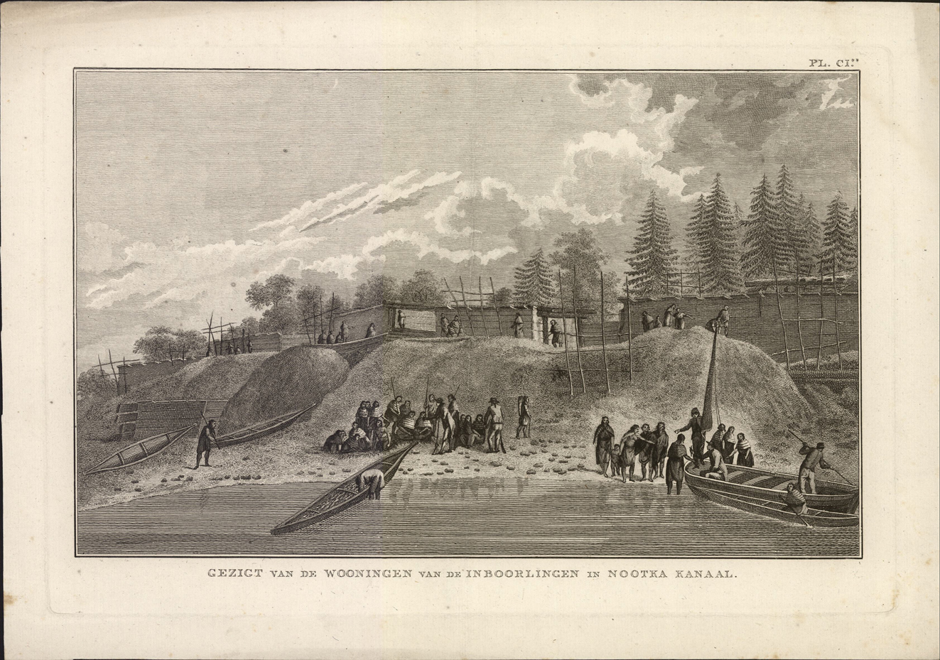 titel midden onder de afbeelding: Gezigt van de wooningen van de inboorlingen en Nootka Kanaal.