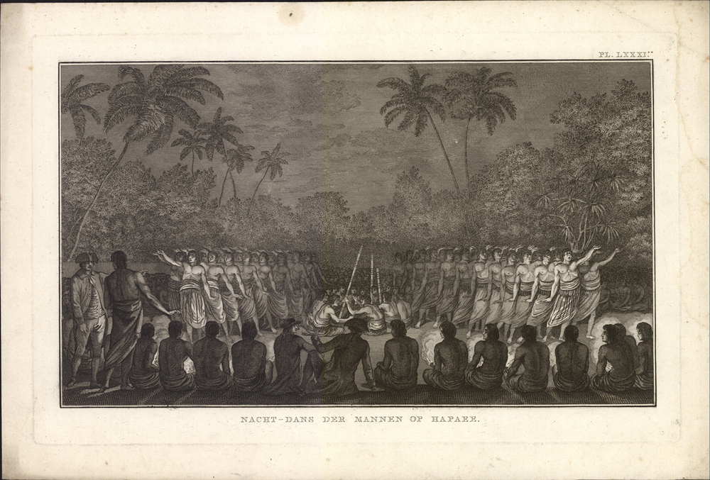 titel midden onder de afbeelding: Nacht-dans der mannen op Hapaee