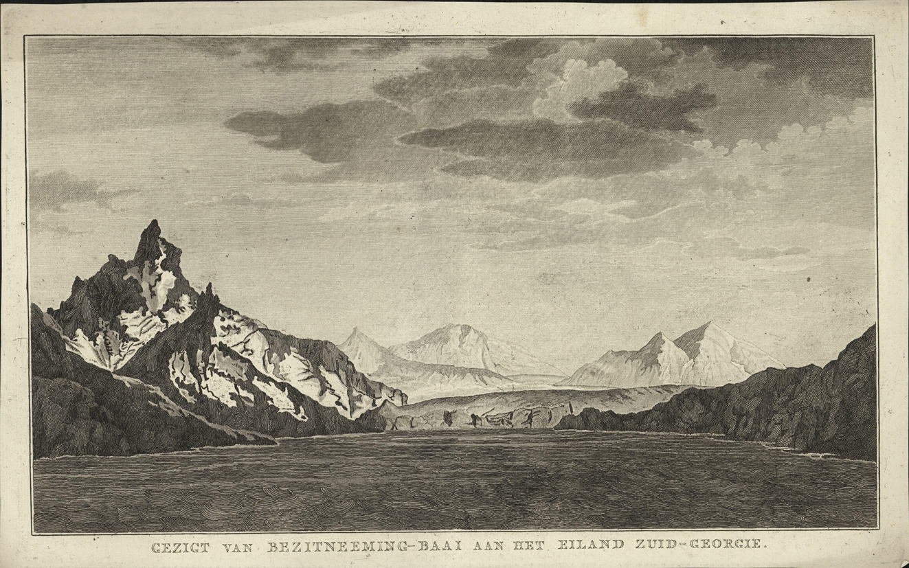 - titel midden onder de afbeelding: Gezigt van Bezitneeming-Baai aan het eiland Zuid-Georgie