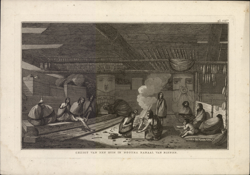 titel midden onder de afbeelding: Gezigt van een huis in Nootka Kanaal van binnen