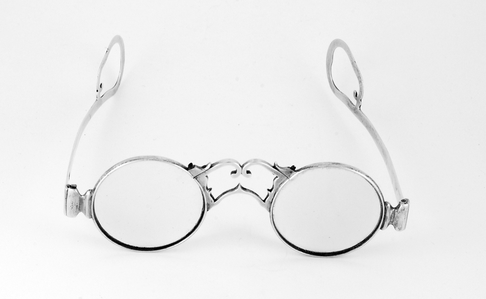 Leesbril; zilvermontuur met twee vlakke, gladde benen met omgebogen uiteinden, lopend naar boven en beide scharnierend aan het ronde lunet; het lunet verbonden door een dubbele symmetrische brug, bovenste gedeelte met C-vormig ornament. Glas rond en geslepen, in het glas zitten kleine luchtbellettjes.