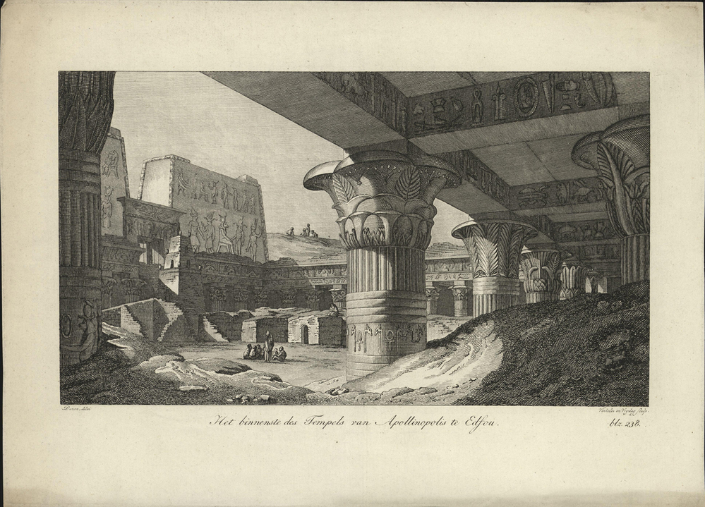 - opschrift midden onder afbeelding: Het binnenste des Tempels Apollinopolis te Edfou.