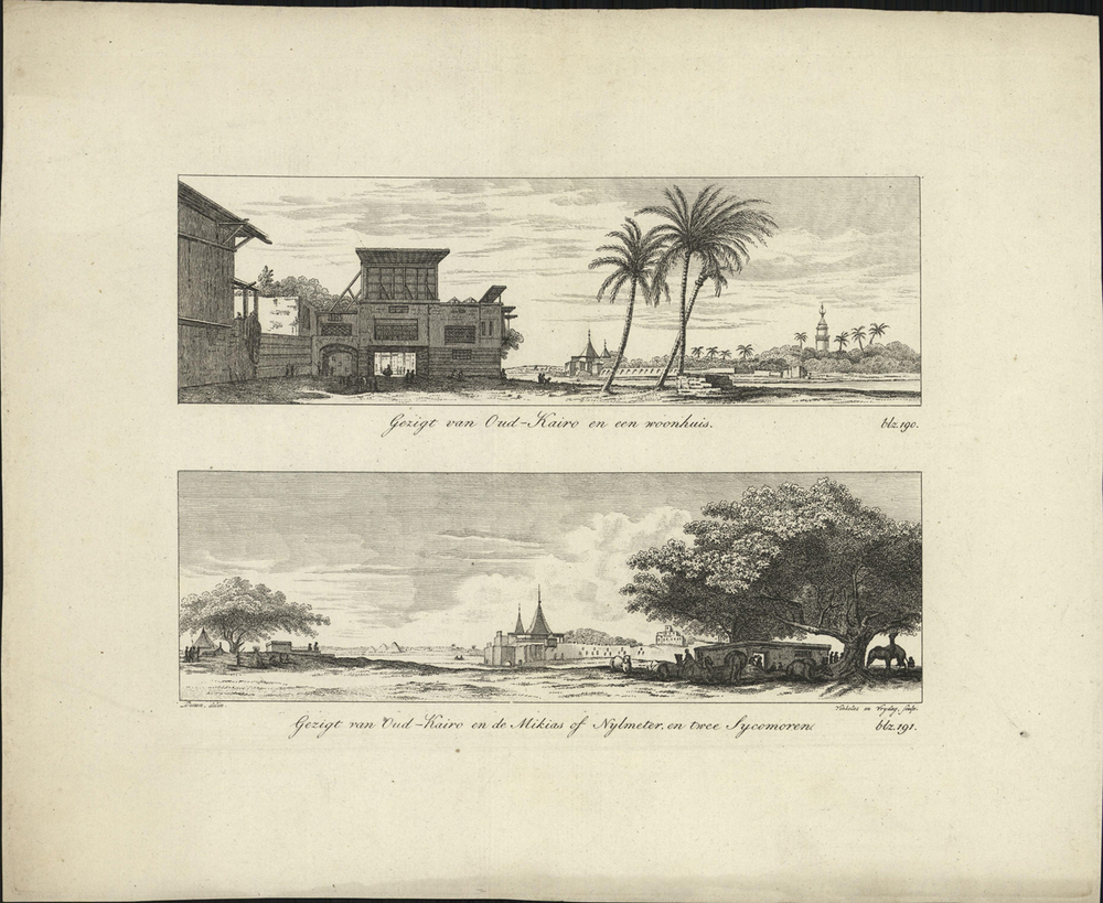opschrift midden onder onderste afbeelding: Gezigt van Oud-Kairo en de Mikias of Nylmeter, en twee Sycomoren.