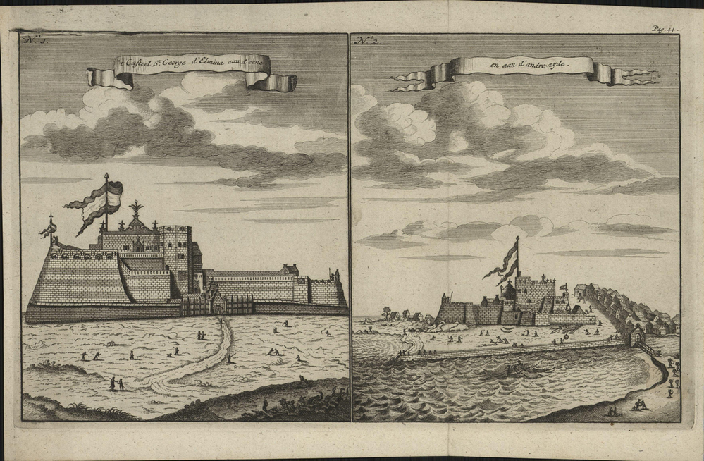 opschrift links bovenin de eerste afbeelding in de banner: 't Casteel St. George d'Elmina aan d'eene