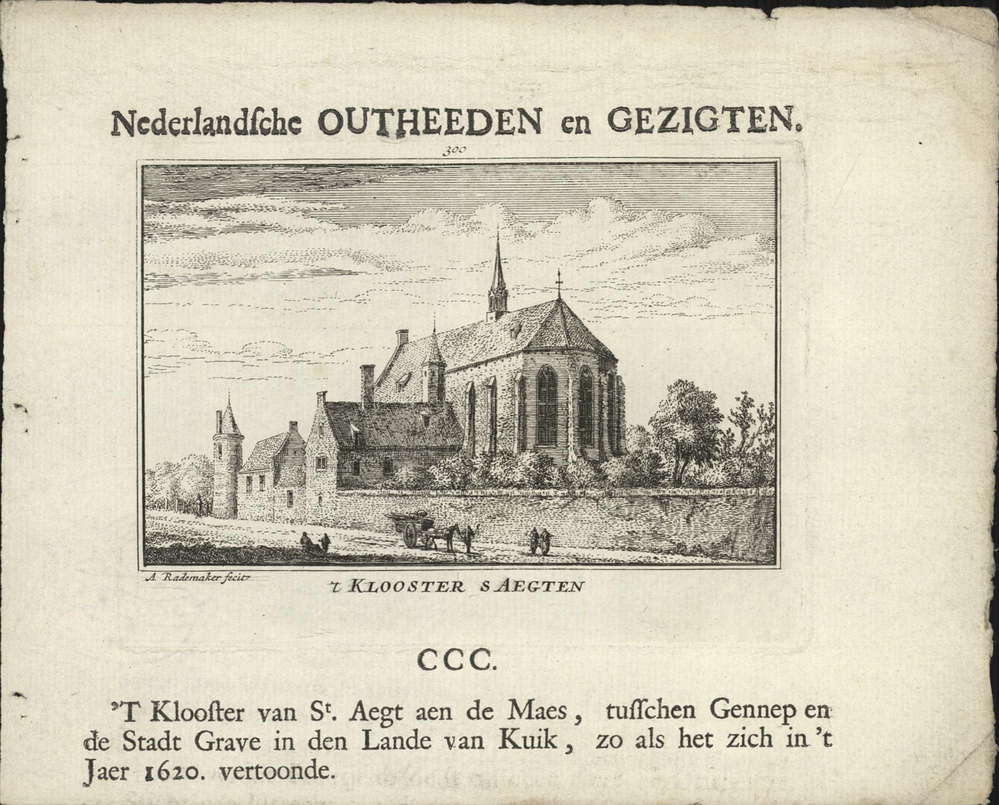 opschrift midden onder de afbeelding: CCC./ 'T Klooster van St. Aegt aen de Maes, tusschen Gennep en/ de Stadt Grave in den Lande van Kuik, zo als het zich in 't/ Jaer 1620. vertoonde.