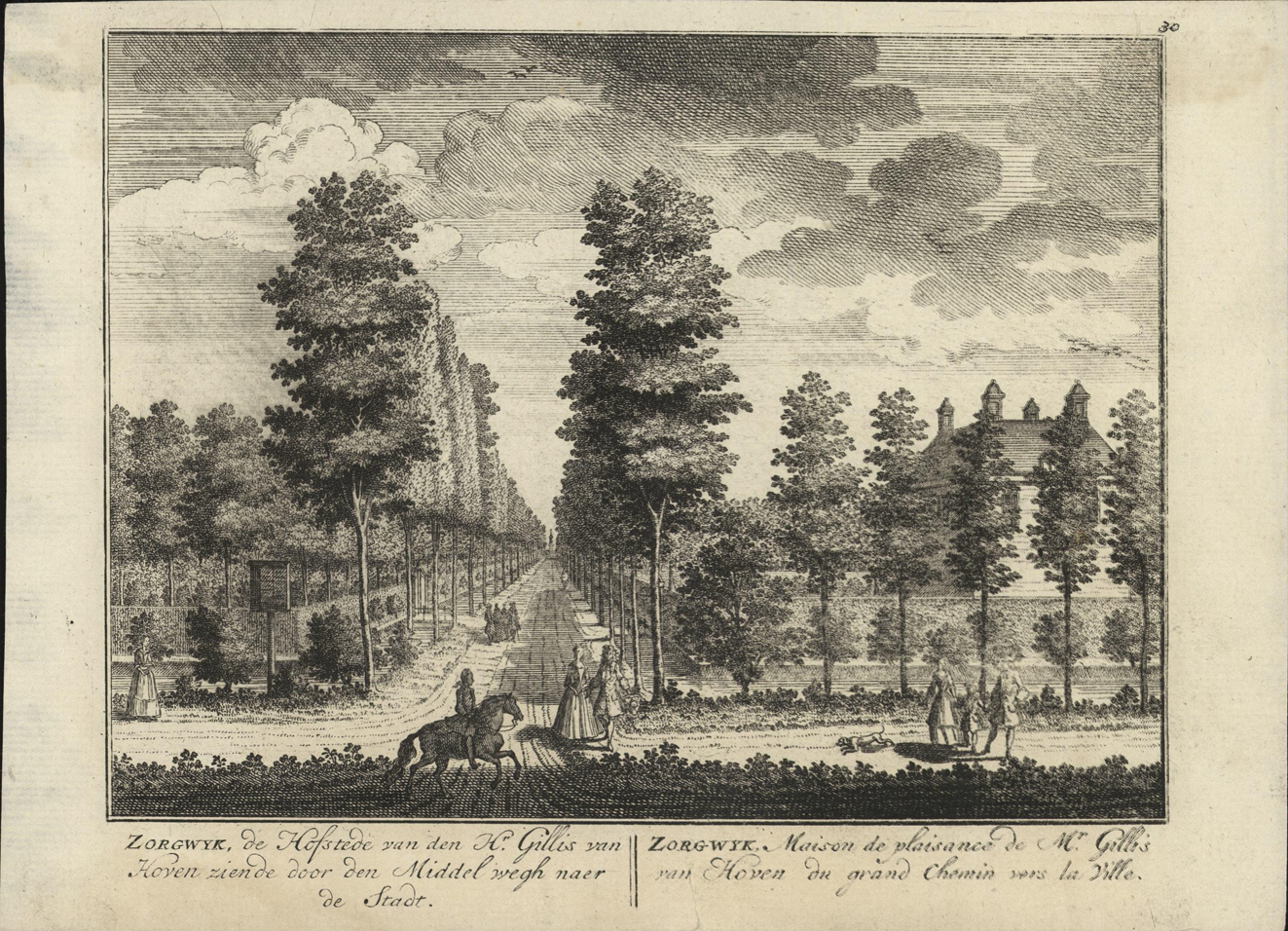 opschrift rechts onder in de marge: ZORGWYK, Maison de plaisance de Mr. Gillis/ van Hoven du grand Chemin vers la Ville.