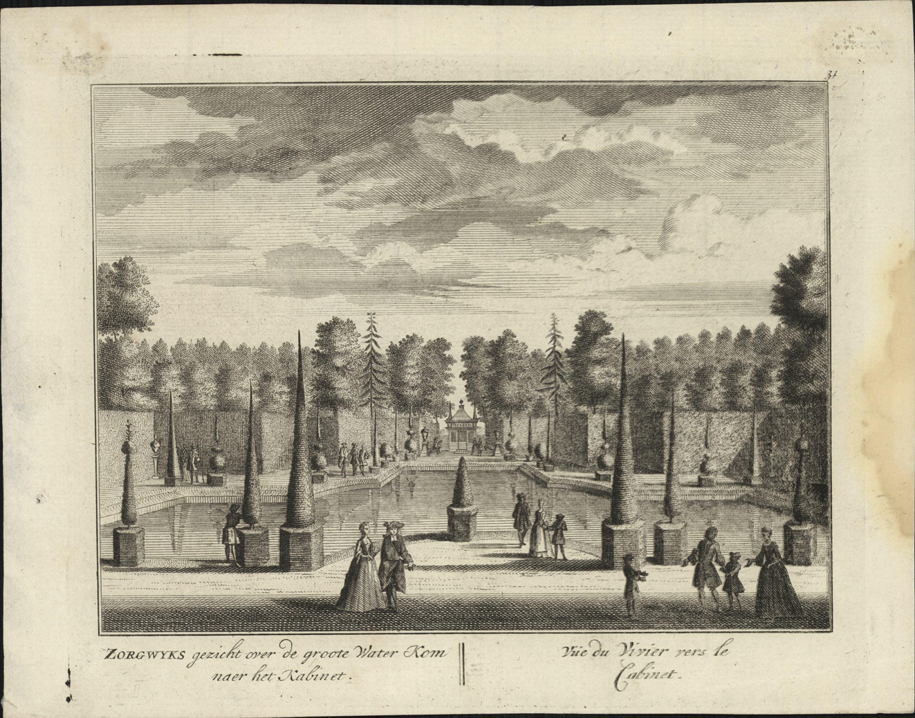 opschrift links onder in de marge: ZORGWYKS gezicht ovre de groote Water Kom/ naer het Kabinet.