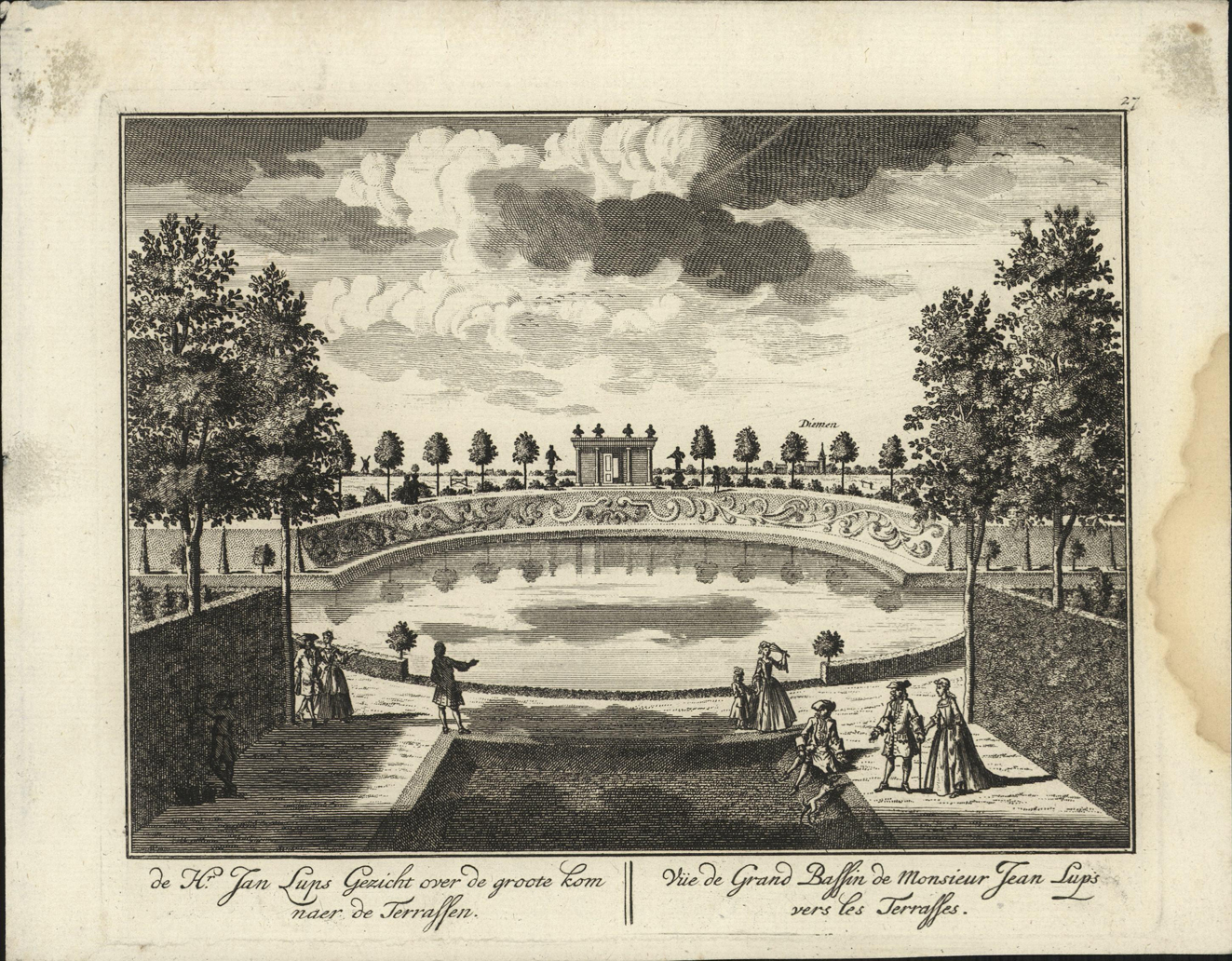 opschrift midden onder in de marge: de Hr. Jan Lups Gezicht over de groote kom/ naar de Terrassen.