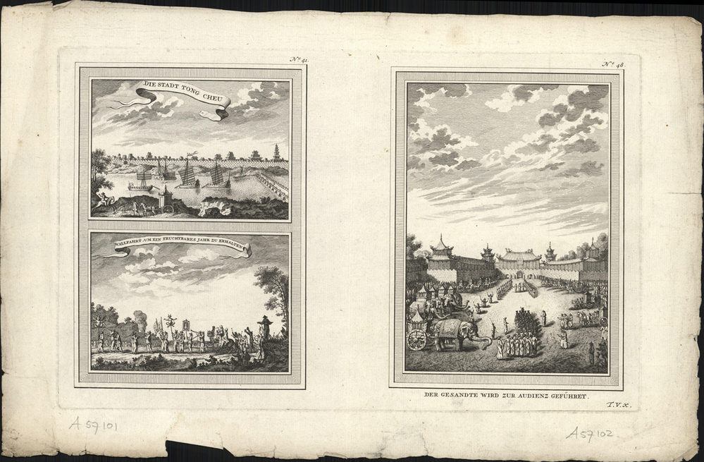 Drie prenten op 1 blad: De stad Tong Cheu, Bedevaart voor een vruchtbaar jaar, Audientie van een gezant
