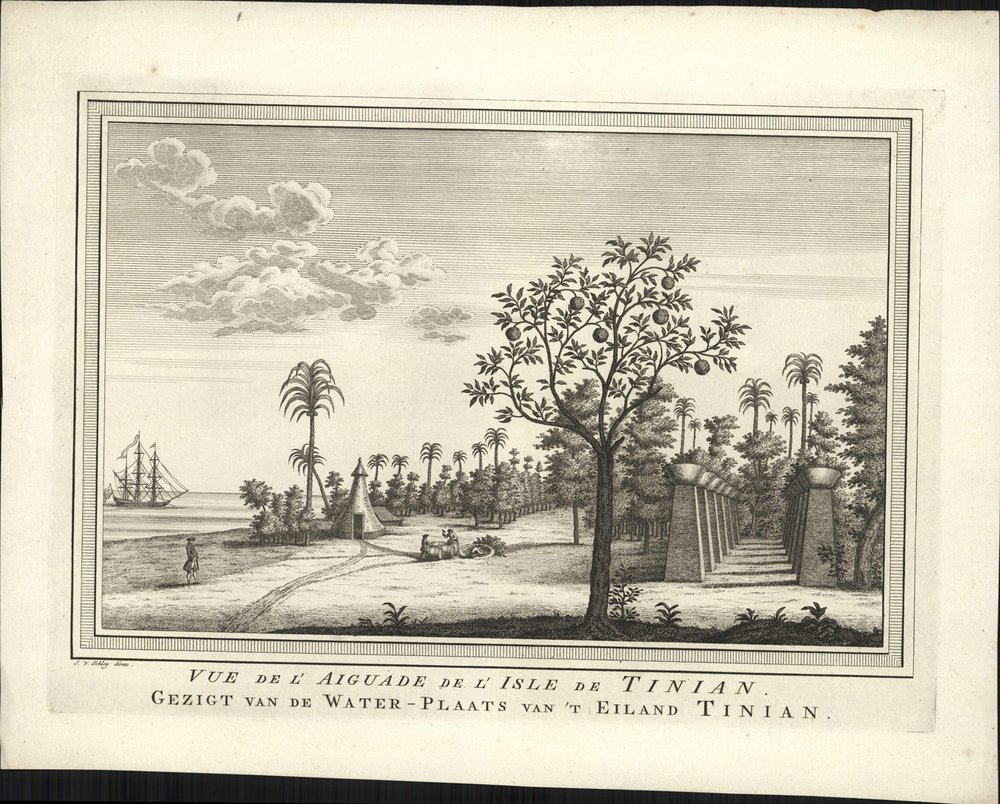 - opschrift midden onder in marge: VUE DE L'AIGUADE DE L'ISLA DE TINIAN./ GEZIGT VAN DE WATER-PLAATS VAN 'T EILAND TINIAN.