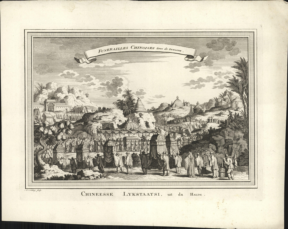 opschrift midden bovenin de afbeelding in de banner: Funerailles Chinoises tirees de Duhalde. - aangetroffen 1985-02