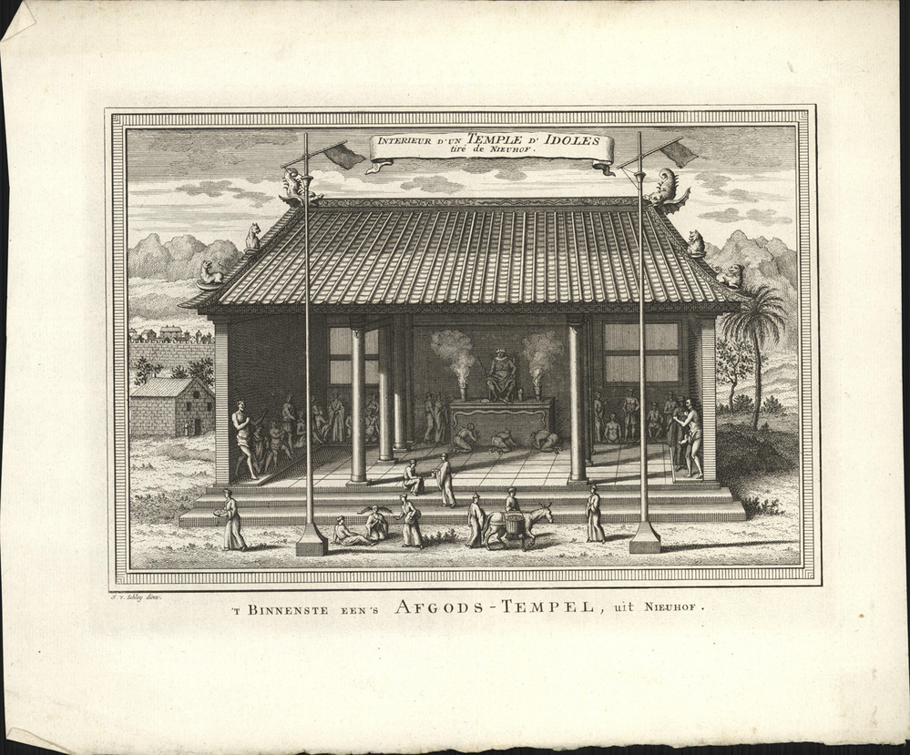 - titel midden onder de afbeelding: 't Binnenste een's Afgods-Tempel, uit Nieuhof.