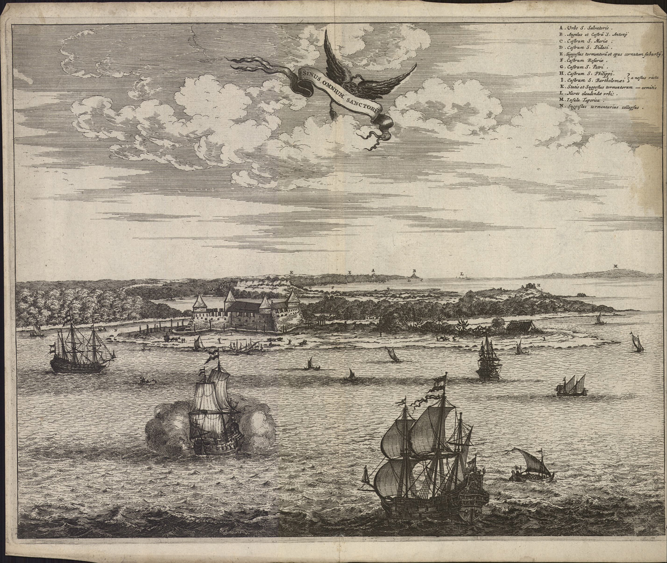 opschrift rechts boven in afbeelding: A. Urbs S. Salvatoris. / B. Angulus et Castru: S. Antonij. / C. Castrum S. Mariae. / D. Castrum S. Didaci. / E. Suggestus tormentoru: et opus cornutum suburbij. / F. Castrum Rosariae. / G. Castrum S. Petri. / H. Castrum S. Philippi. / I. Castrum S. Bartholmaei. K. Statio et Suggestus tormentorum_comitis. / L. Naves claudendae urbi. / M. Insula Taperica. / N. Suggestus tormentarius collapsus.