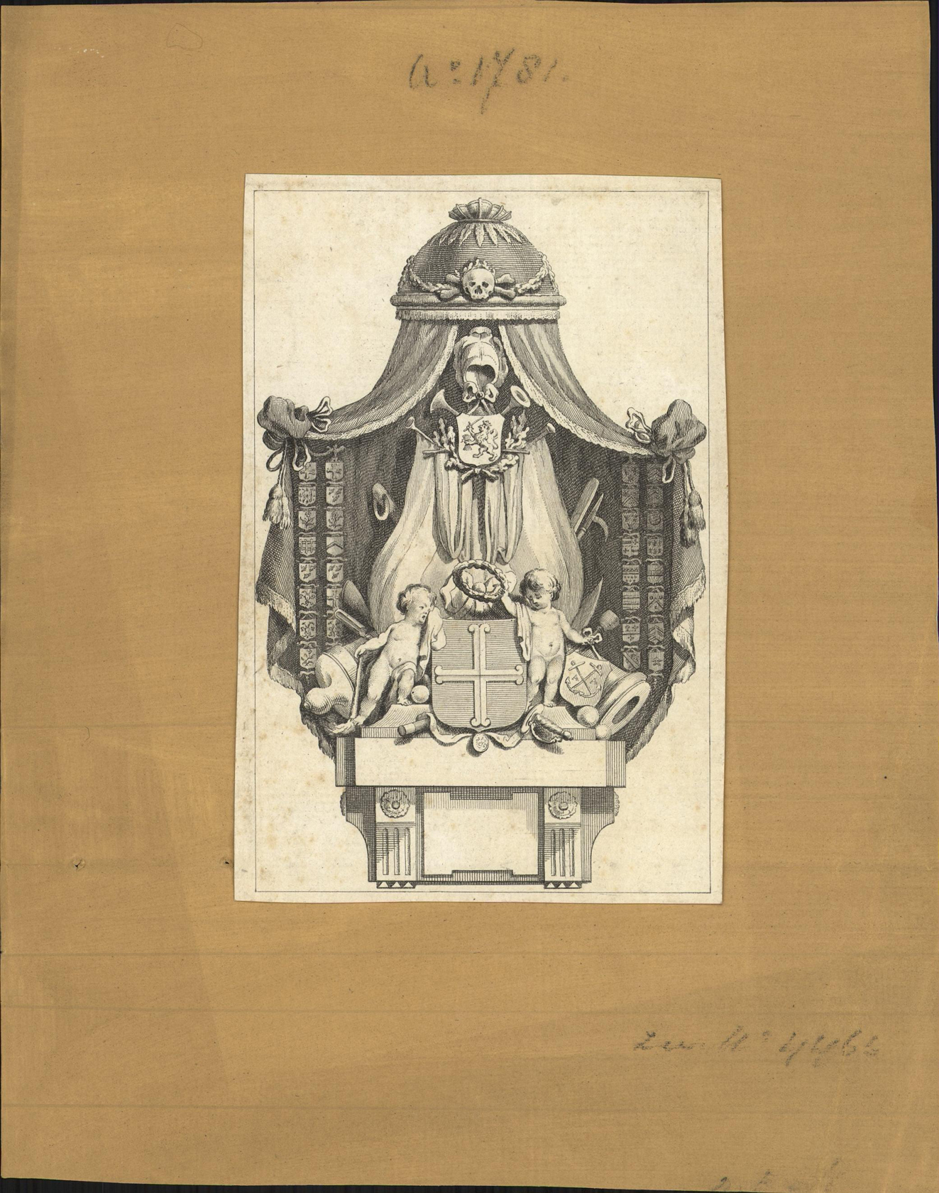 Gravure avant la lettre. Afgebeeld is een graftombe. Onder een baldakijn het wapen van de Republiek der Verenigde Nederlanden, waaronder een tweetal vlaggen, waaronder het wapen van Bentinck, geflankeerd door een tweetal engelen en diverse wapens.- Trefwoorden