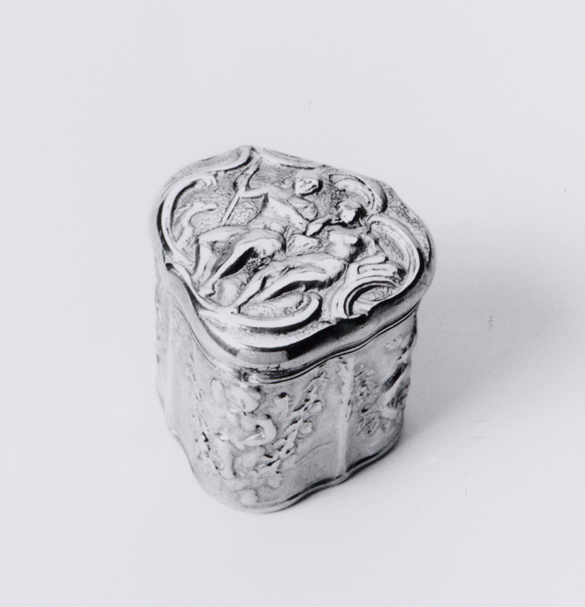 Cartouchevormige doos met rechte achterzijde en scharnierend deksel. Profielrand langs onderrand doos en deksel. Gedreven reliëfdecors op een geruwde ondergrond. Op deksel een voorstelling van een liefdespaar en een hond tussen C- en S-voluten. Wanden met vier gevleugelde kinderfiguren tussen bloemguirlandes. Op binnenrand doos en deksel is het Romeinse cijfer: III/ gegrift.