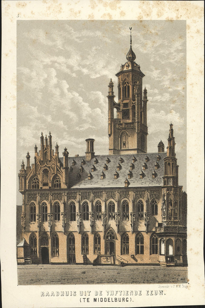 - opschrift midden onder de afbeelding: RAADHUIS UIT DE VIJFTIENDE EEUW./ (TE MIDDELBURG).