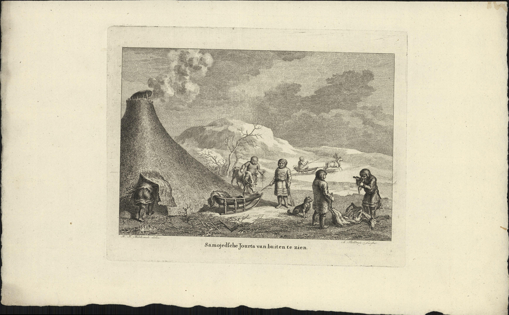 - opschrift midden onder de afbeelding: Samojedsche Jourta van buiten te zien.