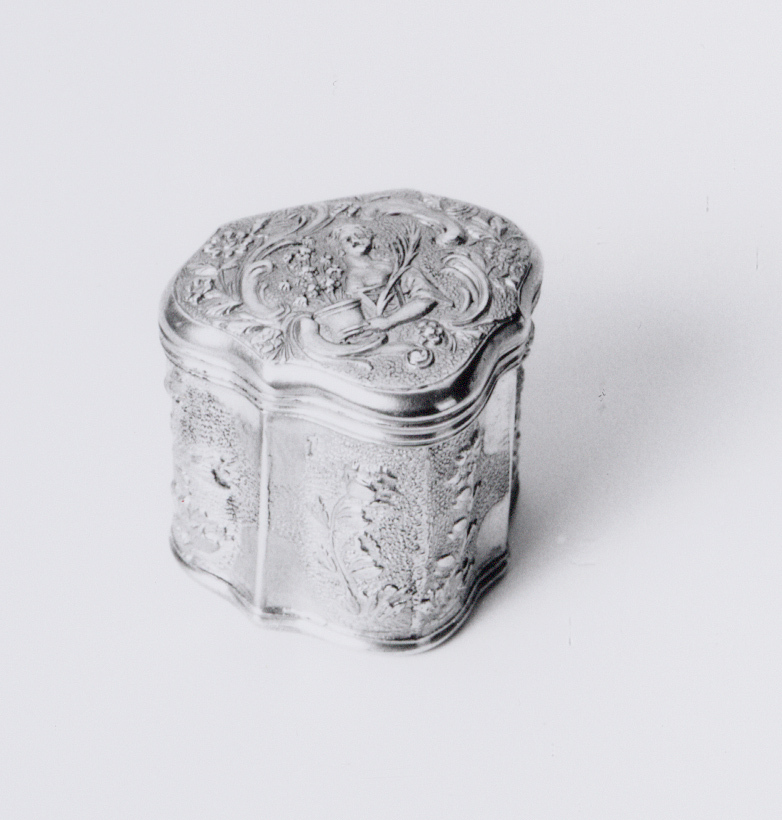 Cartouchevormige doos met rechte achterzijde en scharnierend deksel. Profielrand langs onderrand doos en deksel. Reliëfdecors op een geruwde ondergrond. Op deksel een voorstelling van een vrouwenfiguur met een bloeiende plant en een palmtak. Wanden met vier voorstellingen van bloemtakken. Op sluitrand en binnenrand deksel is het Romeinse cijfer: V/ gegrift.