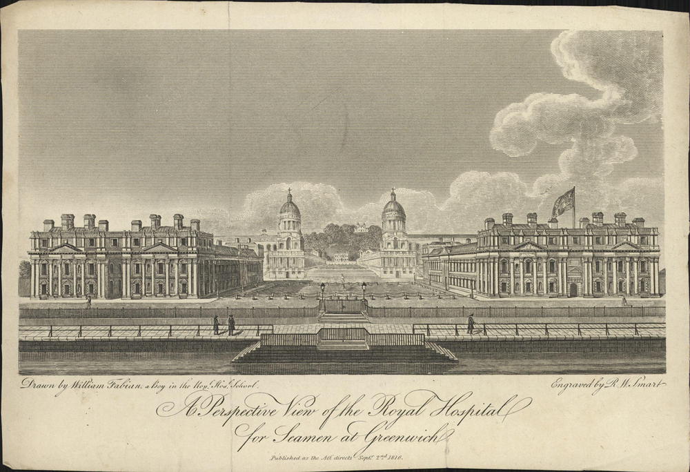 titel midden onder de afbeelding: A perspective view of the Royal Hospital for Seamen at Greenwich