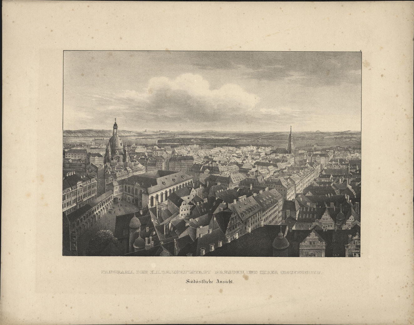 - opschrift midden onder afbeelding: PANORAMA DER K.S. RESIDENZSTADT DRESDEN UND IHRER UMGEBUNGEN.