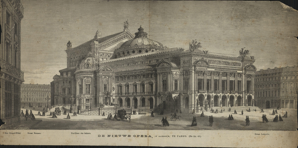 - opschrift midden onder afbeelding: DE NIEUWE OPERA, IN AANBOUW, TE PARIJS (Zie blz. 43.)