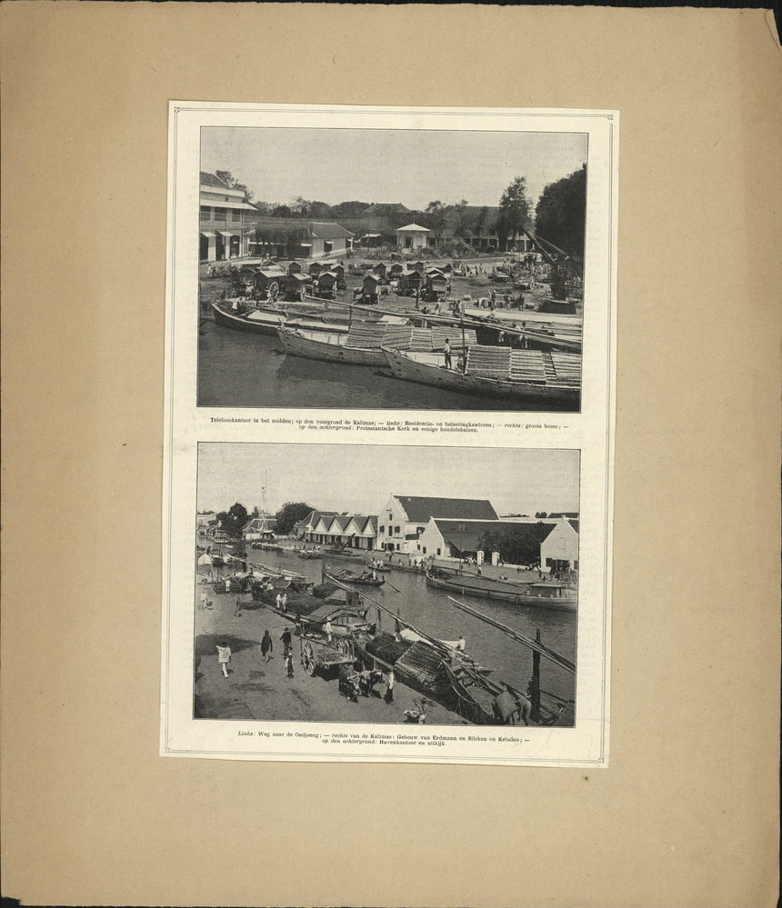 opschrift onder bovenste foto: Telefoonkantoor in het midden; op den voorgrond de Kalimas; - links: Residentie- en belastingkantoren; - rechts: groote boom; - op den achtergrond: Protestantsche Kerk en eenige handelshuizen.