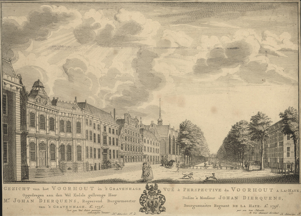 - opschrift marge: Gezicht van het Voorhout in 's Gravenhage / opgedragen aan den Wel Eedele gestrenge Heer Mr. Johan Dierquens, Regeerend Burgermeester van 's Gravenhage. Ao. 1756 / Door zijn Wel Eedele gestrenge ootmoedigste dienaar H. Scheurleer F. Z.