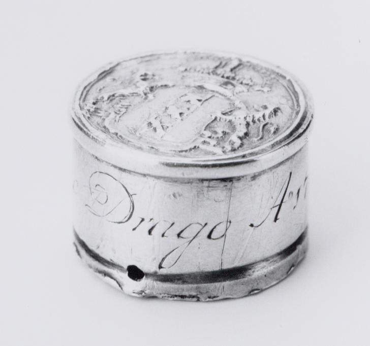 Isaac Drago (onbek.-1747) was van Portugees-joodse afkomst. Hij was makelaar van 1730 tot zijn overlijden in Amsterdam in 1747 (AHM, Documentatiearchief). Deze zilveren dop is het enige dat rest van het makelaarsstokje van Drago. Zie voor een - eveneens aan Bernardus Leeking toegeschreven - zilveren dop van het stokje van een andere joodse makelaar: cat.nr. KA 7178, tevens voor verder commentaar. Het Rijksmuseum te Amsterdam bezit een compleet makelaarsstokje van Leeking (De Lorm 2001~2, p. 103 nr. 50). ( Bert Vreeken)
