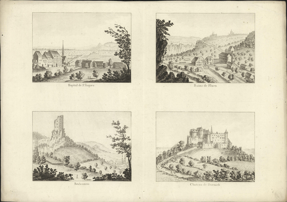 - opschrift marge: Hopital de St. jaques / Bains de Fluen / Rechenstein / Chateau de Dornach
