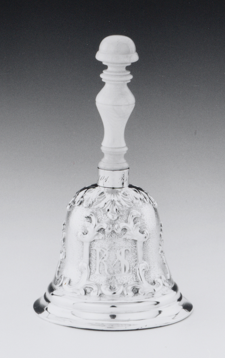 Klokvormige bel met klepel en balustervormige ivoren steel met profielranden en halfbolle knop. Op wand twee door bloem- en bladranken gevormde cartouches, alternerend met acanthusbladeren op een geruwde ondergrond. Het ene cartouche met twee kruiselings geplaatste korenschoven, waartussen een ovaal schildje waarop is gegraveerd: April 1851./. Het andere met het monogram: MKLRS/, de medeklinkers in het woord 'makelaars'. Schouder met straalsgewijs geplaatste krans van acanthusbladeren. Op manchet rond aanzet steel is gegraveerd: 23 April Ao 1801./.