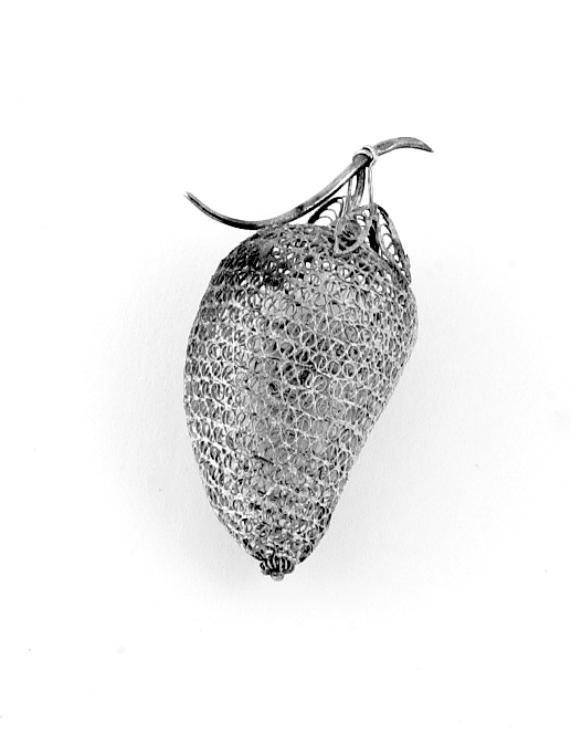 Tropische vrucht in de vorm van een papaya of mango in filigrain aan een flauw F-vormig gebogen takje met vier filigrain blaadjes.- Trefwoorden