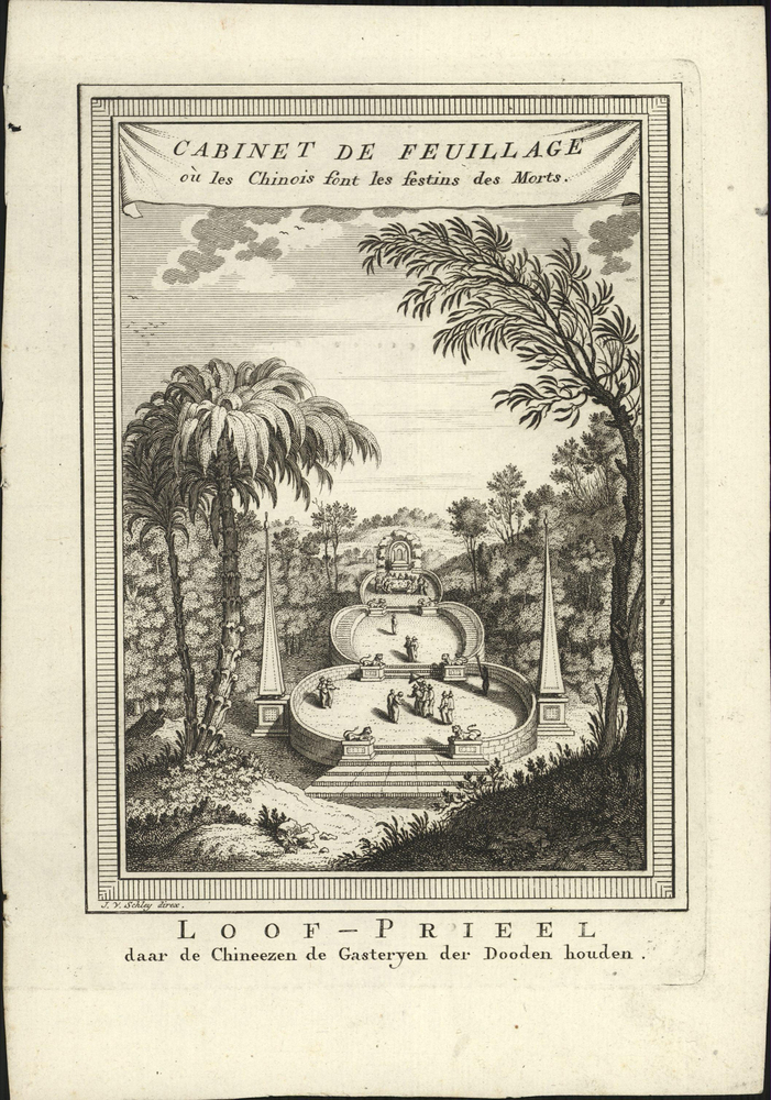 opschrift bovenin de afbeelding: Cabinet de Feuillage ou les Chinois font les festins des Morts.