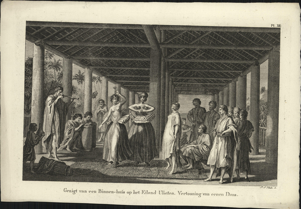 titel onder de afbeelding: Gezigt van een Binnen-huis op het Eiland Ulietea. Vertooning van eenen Dans.