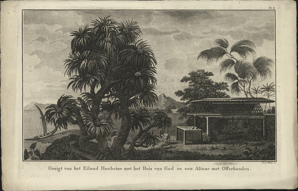titel midden onder de afbeelding: Gezigt van het Eiland Huaheine met het huis van God en een Altaar met Offerhanden