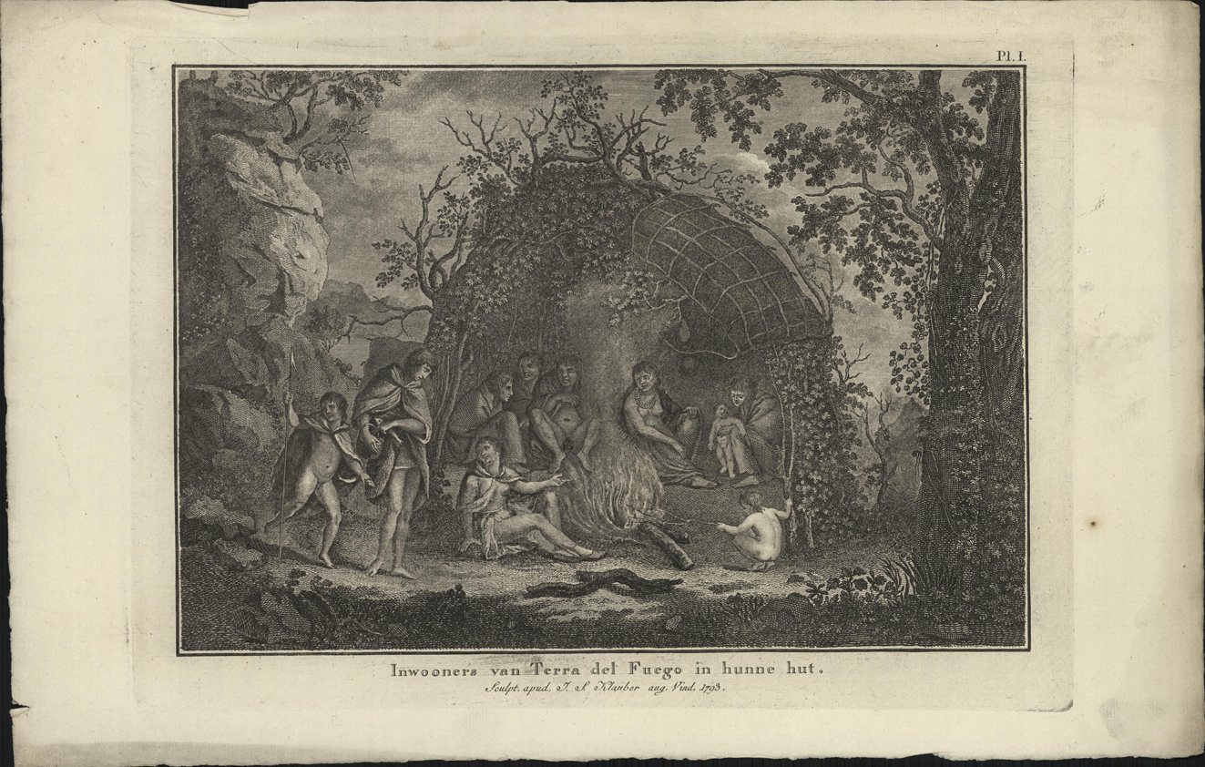 titel midden onder de afbeelding: Inwooners van Terra del Fuego in hunne hut