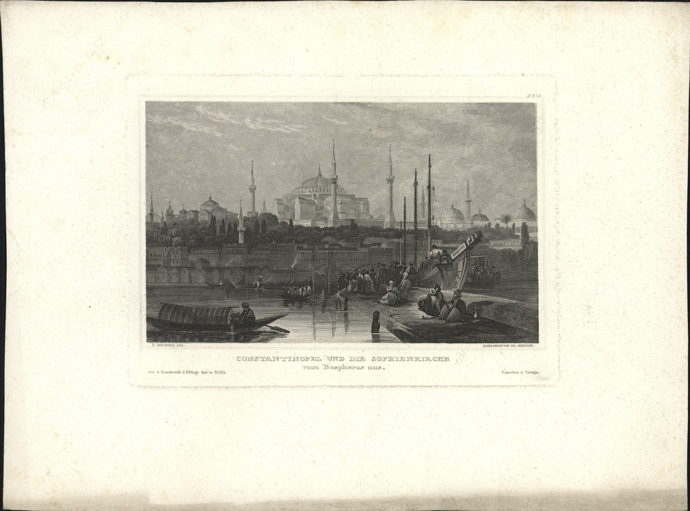 opschrift midden onder afbeelding: CONSTANTINOPEL UND DIE SOPHIENKIRCHE/ vom Bosphorus aus.