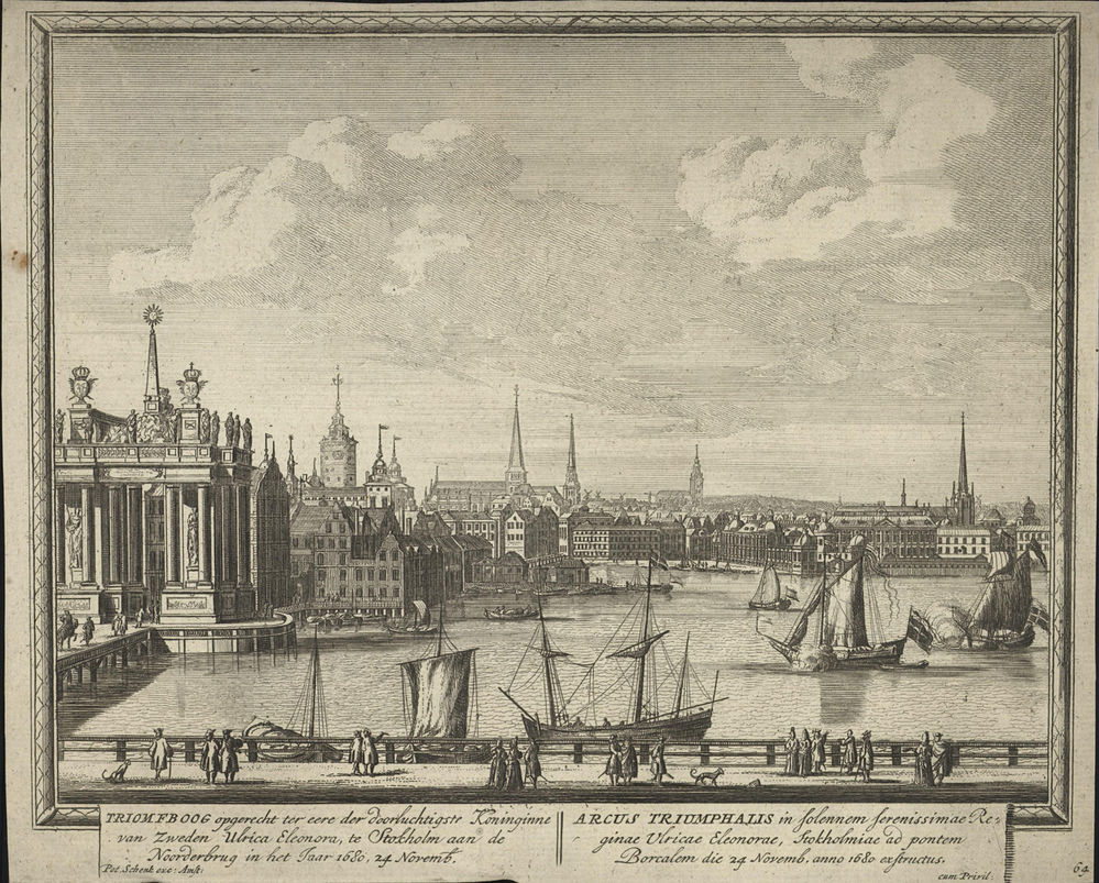 opschrift l.o. de afb.: Triomfboog opgerecht ter eere der doordoorluchtigste Koninginne van Zweden Ulrica Eleonora, te Stockholm aande Noorderbrug in het jaar 1680, 24 Novemb.