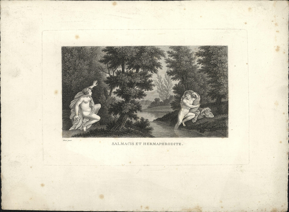 De waternimpf Salmacis bespied heimelijk de jager Hermaphroditus als hij gaat baden in een meer.- Trefwoorden