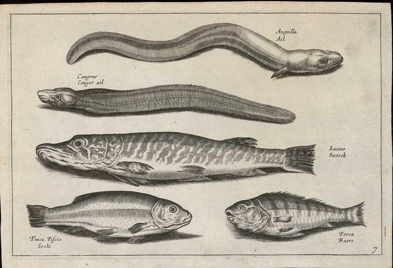 - opschrift bij de afbeelding: Anguilla - Ael; Congrus - Conger ael; Lucius - Snoock; Tinca Piscis - Seele; Perca - Baers