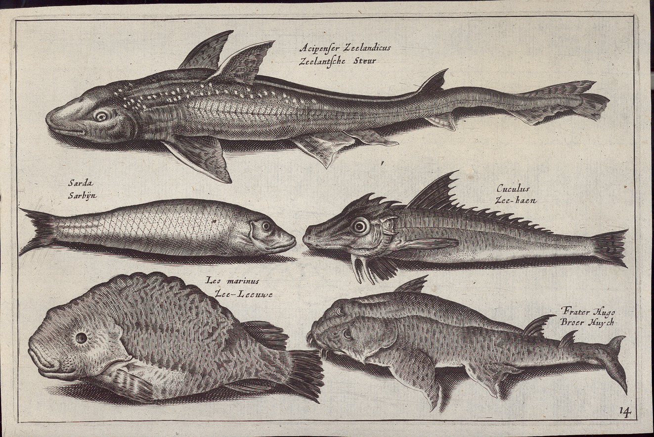 - opschrift bij de afbeelding: Acipenser Zeelandicus - Zeelantsche Steur; Sarda - Sardijn; Cuculus - Zee-haen; Leo marinus - Zee-Leeuwe; Frater Hugo - Broer Huych