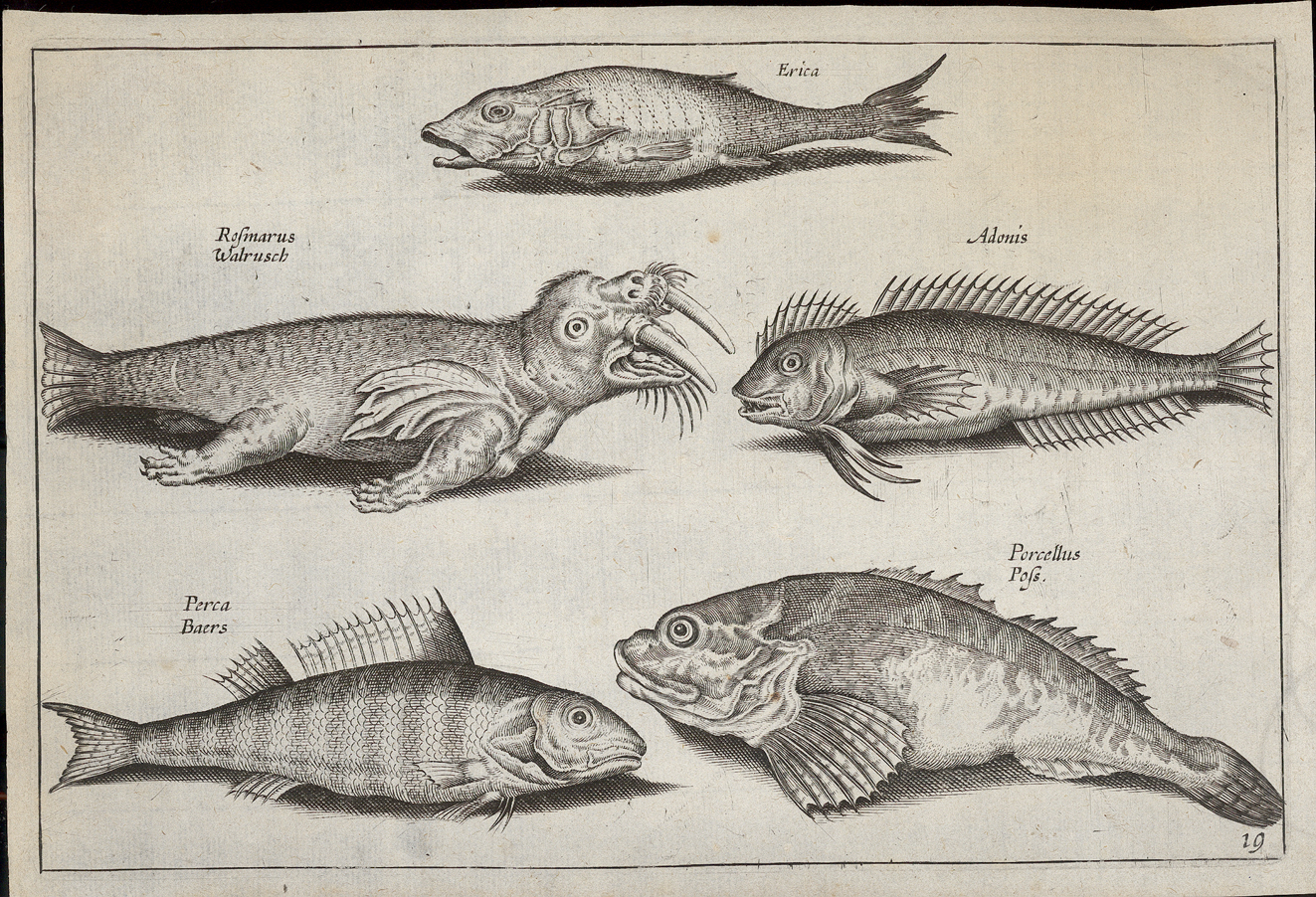 - opschrift bij de afbeelding: Erica; Rosmarus - Walrusch; Adonis; Perca - Baers; Porcellus - Poss