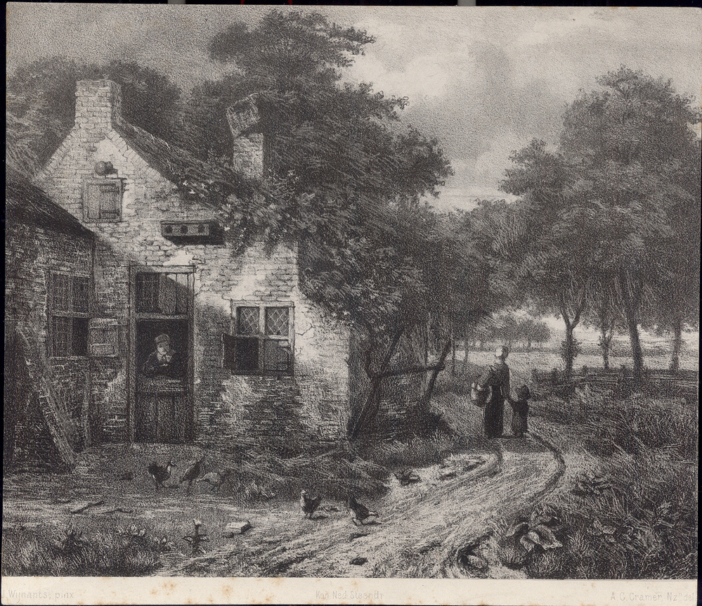 Boerenhuisje, zandpad, kippen, bomen.- Trefwoorden